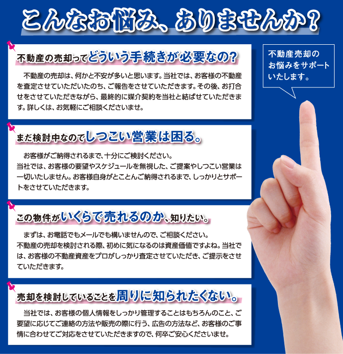 一戸建やマンション、土地など不動産売却に関するご相談は、いつでも親切・丁寧にご対応をさせていただきます。